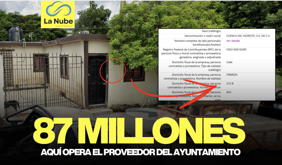 Ahí, en una zona habitacional de la colonia Vamos Tamaulipas, está registrado el cuartel operativo de Cuenca del Noreste, S.A. de C.V., la empresa que recibió los contratos ADJ/MVT/185-2025 y ADJ/MVT/187-2025 para encargarse del mantenimiento de transformadores eléctricos y sistemas de aire acondicionado del municipio.